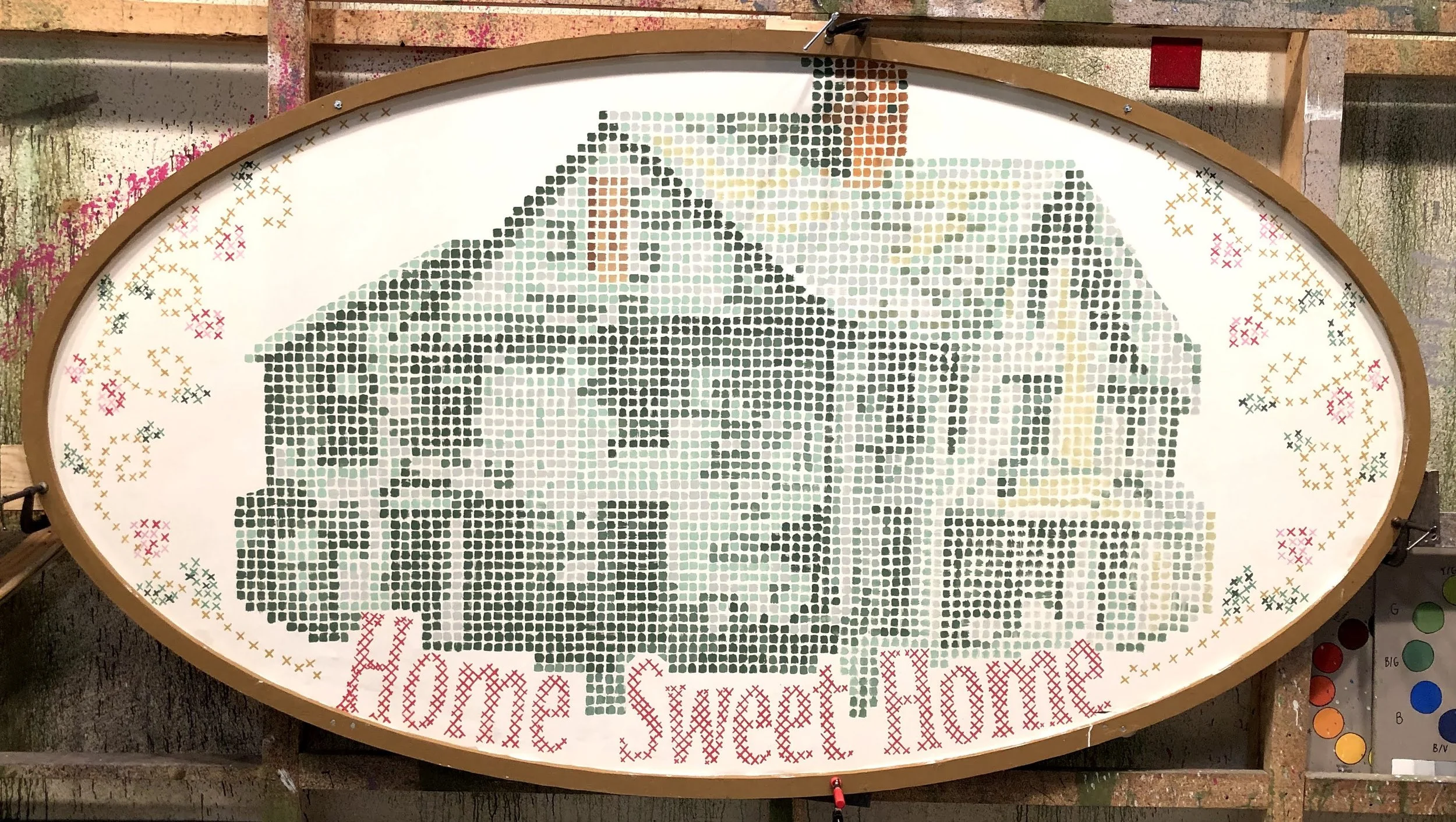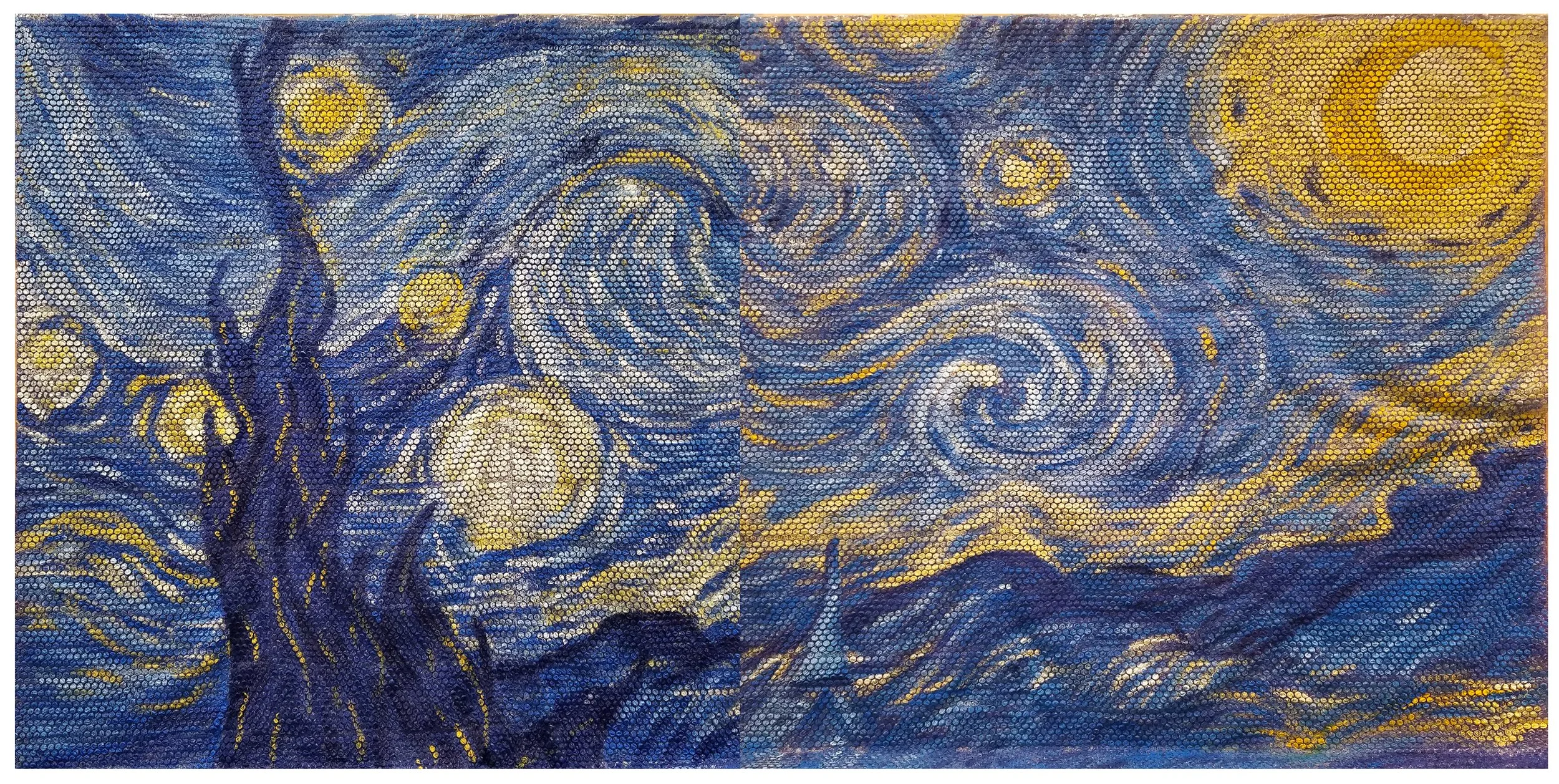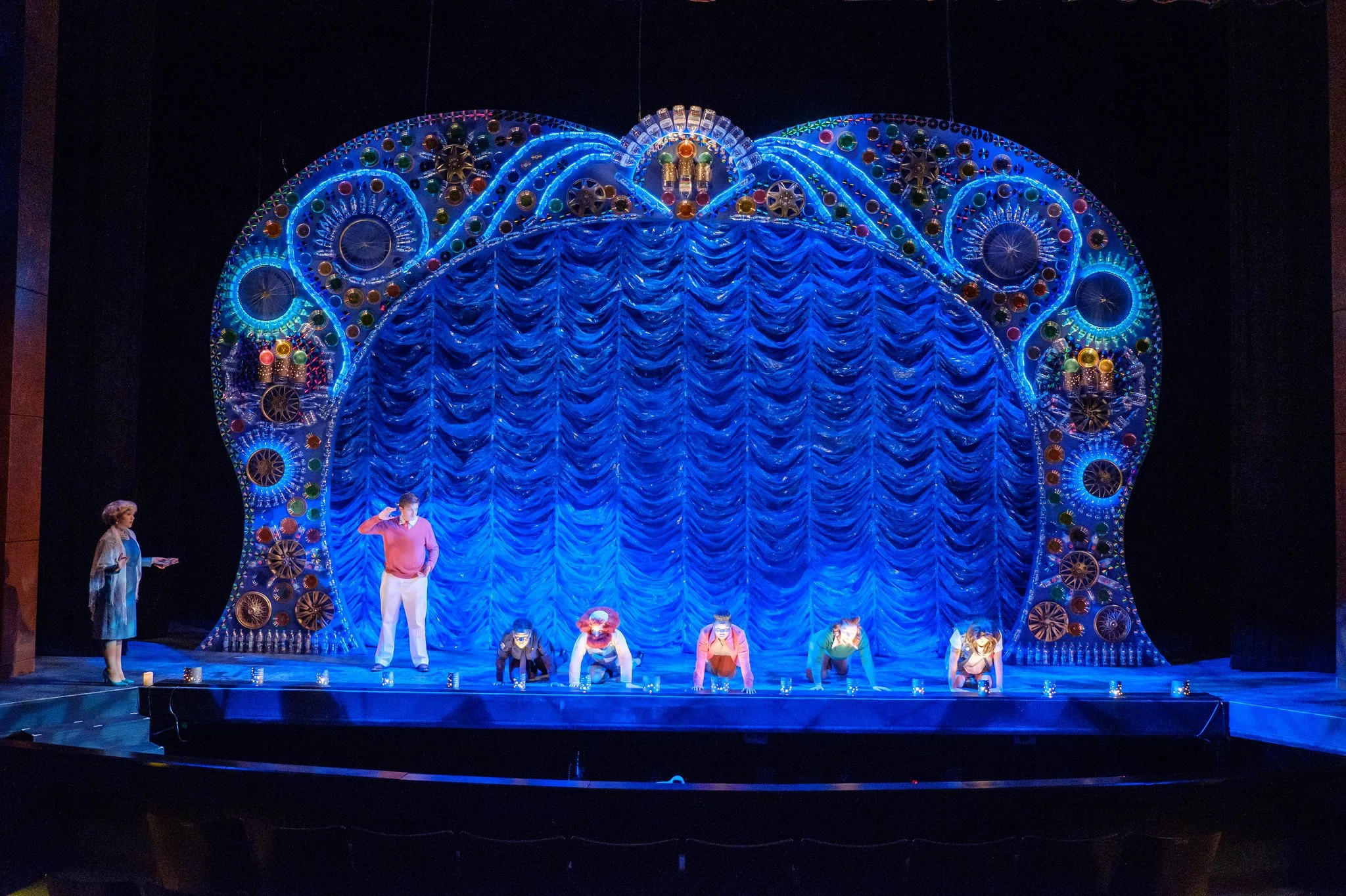 Found Object Portal: constructed with over 1,000 recycled plastic bottles, CDs, plastic plates, hubcaps, bicycle wheels and led tape. Austrian Trash Bag Curtain: operable Austrian style curtain constructed from over 2,500 blue trash bags, standard staples, heavy duty packaging tape, pleating math headaches and loving care.